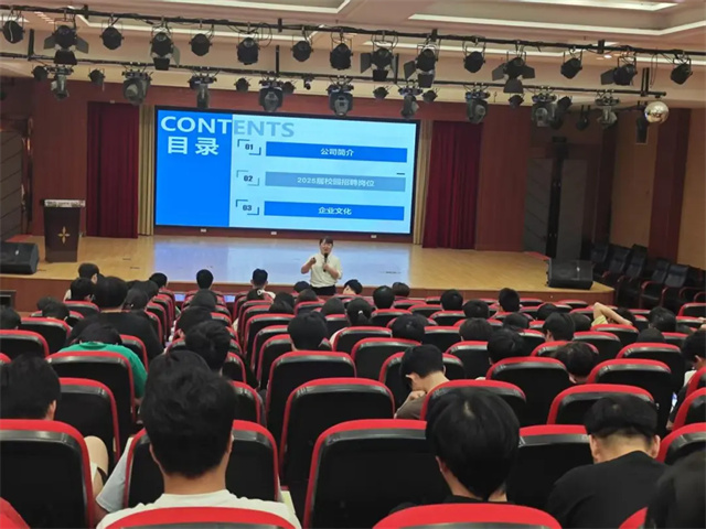 宣讲会上,宁波阿尔卑斯电子有限公司人事部王经理通过企业宣传片和PPT展示,详细介绍了公司的发展历程、行业地位、业务布局、核心业务板块以及企业文化。他重点讲解了本次实习招聘的岗位需求、培养体系、薪资福利和职业发展通道,并表示:“我们希望通过实习计划,让同学们在实践中快速成长,为企业储备优质人才。”
