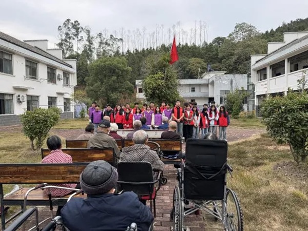 当《当你老了》的旋律响起,同学们用歌声向老人们致以节日问候。熟悉的曲调中,歌词承载的时光印记与深情守护,如暖风拂过老人们的心田。他们或眼中泛起泪光,或轻声跟唱,或静静聆听,在歌声里感受到了年轻一代最真挚的关怀与陪伴。