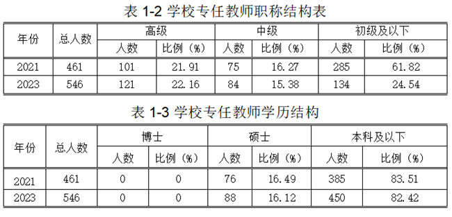 学校现有教职工总数686人,专任教师数546人,“双师型”教师数157人,占专任教师的比例28.75%;具有副高及以上专业技术职称教师数为121人,占专任教师的比例为22.16%;具有研究生及以上学历或硕士学位的教师数为88人,占专任教师的比例为16.12%。教师队伍整体素质有进一步改善。
