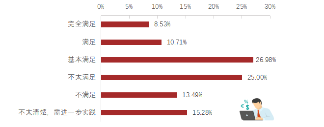 46.23%的毕业生认为所学专业的课程满足岗位要求,其中“完全满足”的占比为8.53%,“满足”的占比为10.71%,“基本满足”的占比为26.98%。