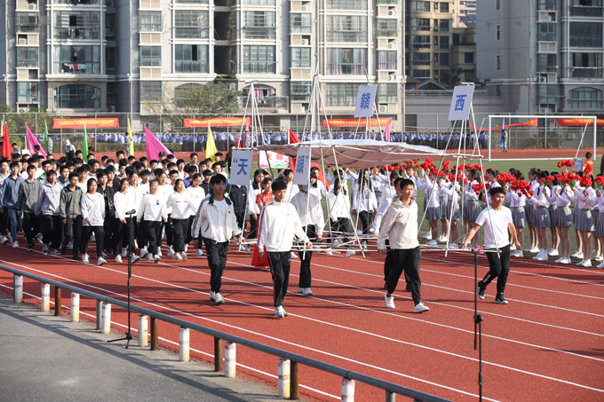 伴随着铿锵有力的运动员进行曲,国旗、会旗、会徽、彩旗方阵、鲜花队、各二级学院代表队、裁判员方阵队相继入场。整齐划一的方阵、坚定有力的步伐赢得了现场观众的阵阵喝彩。各方阵队特色,充分展现自身的特色,政法学院用装饰的警车开道,人工智能学院以无人机领航,“天眼”模型、太阳能发电机、纺织彩车等纷纷亮相运动会开幕式现场,各方队争奇斗艳,精彩纷呈。队员们英姿飒爽,斗志昂扬,传递着青春风采,释放着青春活力。