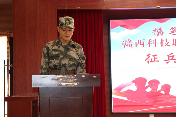 会议随着激昂的国歌和军歌拉开序幕,优秀退役复学士兵代表姚程鹏结合自身经历分享了入伍的心路历程和入伍后的军旅生活。为大家详细解读了学生关心的大学生征兵入伍政策、要求、退伍安置政策、学业优待政策、经济补助政策等。鼓励有入伍意愿的同学从校园地直接报名入伍,实现人生价值,为国防建设贡献自己的力量。