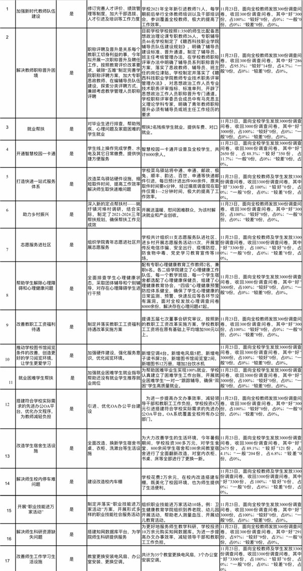 全校管理服务质量逐渐提升,软硬件条件也得到进一步改善,师生的满意度有了大幅度提高。校领导和各级党组织负责人坚持问题导向,认真履行党委主体责任,通过现场督查、现场办公、现场指导等方式,把“严督实导”贯穿“我为师生办实事”全过程各环节,切实提升了“我为师生办实事”的针对性和实效性。