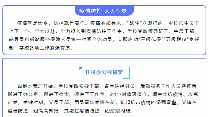 沧海横流,方显英雄本色。教职员工以校为家,夜以继日,默默住校守护,科学防控、精准施策,坚决防止疫情输入校园,全力保障师生的身体健康和生命安全,以实际行动贯彻落实好党的二十大精神。