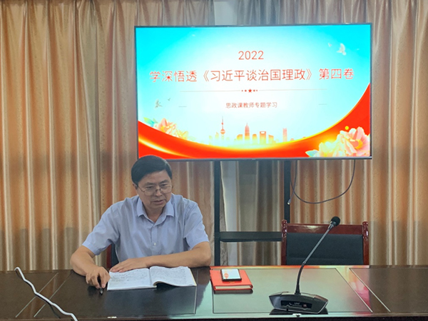 9月14日下午,思政部党支部在学校荣誉室开展《习近平谈治国理政》第四卷专题学习。分管校领导张艺文副校长出席了专题学习会,学习会由思政部党支部书记黄小芬主持,全体思政课教师参加了学习会。