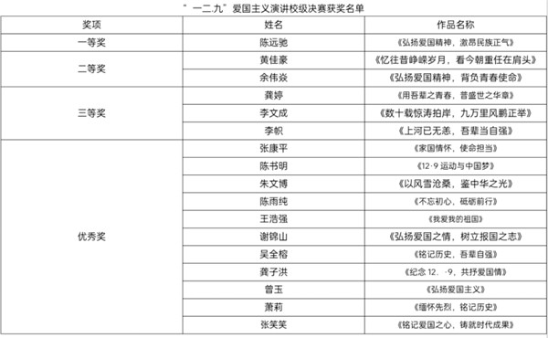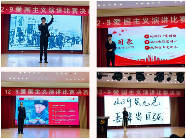 爱国主义演讲比赛 12月8日下午,由校团委主办,校学生会承办的“弘扬‘一二·九’精神 争做新时代青年”爱国主义演讲比赛决赛在学术报告厅举行。