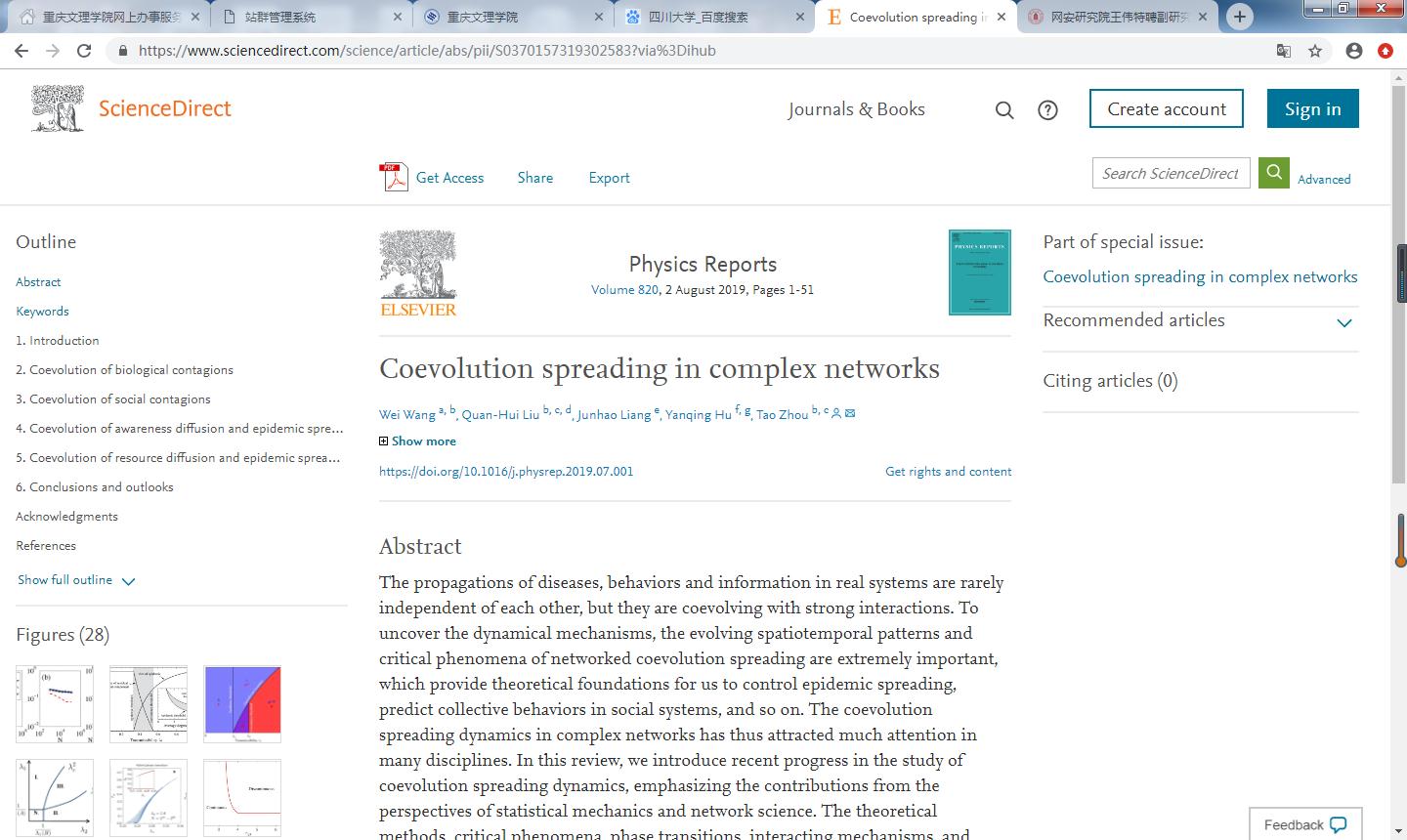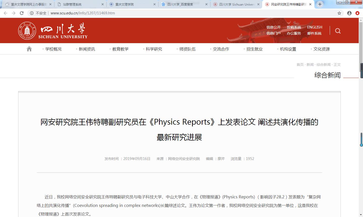 近日,贝博2011届信息与计算科学专业校友、四川大学网络空间安全研究院王伟特聘副研究员与电子科技大学、中山大学合作,在《物理报道》(Physics Reports) (影响因子28.2)发表题为“复杂网络上的共演化传播”(Coevolution spreading in complex networks)长篇综述论文。王伟为论文第一作者,四川大学网络空间安全研究院为第一单位,这也是四川大学在《物理报道》上首次发表论文。